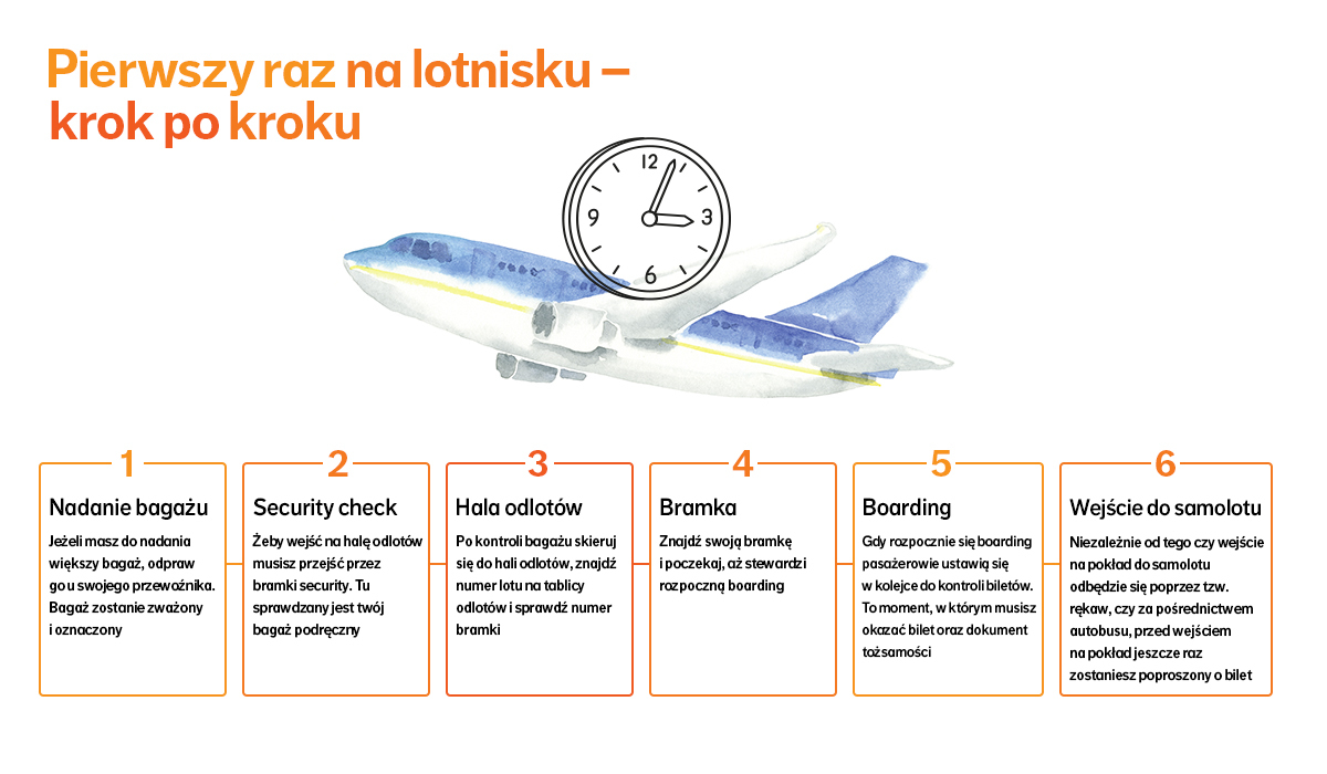 Z pewnością większość podróżujących, którzy pierwszy raz postawią swoją nogę na pokładzie, zastanawiają się, jak wygląda lot samolotem. Zacznijmy więc od początku. Po przybyciu na teren lotniska znajdziemy się na hali odlotów. W tym miejscu na tablicach są wyświetlane numery poszczególnych lotów wraz z bramkami (gate). Gdy znajdziemy swój lot, możemy zacząć podróż. Jednak musimy pamiętać o tym, że pierwszeństwo wejścia na pokład posiadają osoby, które w trakcie zakupu biletów, wykupiły taką usługę u przewoźnika, bądź podróżują klasą, która daje taki przywilej.